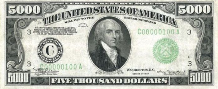 $5000 с портретом Джеймса Мэдисона, 4-го президента США. В настоящее время эти купюры можно положить в банк на депозит. В реальности этим, конечно, никто не занимается, потому что купюры имеют ценность гораздо выше номинала и представляют коллекционный интерес.