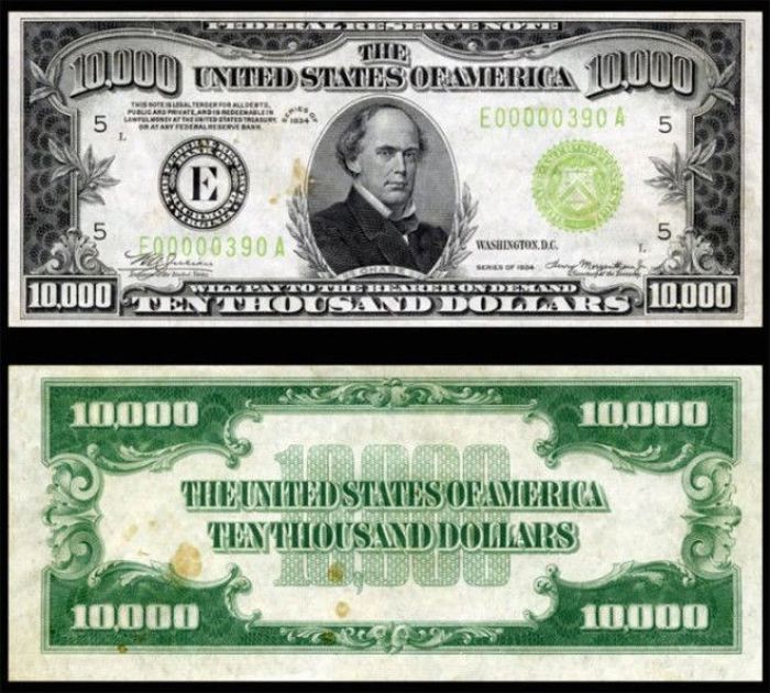 $10000 с изображением Сэмона Портленда Чейза, он был американским государственным деятелем времён гражданской войны в США. Губернатор Огайо, позже Сенатор от штата Огайо, Верховный судья США. А также Чейз занимал пост министра финансов США при Линкольне. Убеждённый противник рабства, он активно боролся с чрезмерным политическим влиянием богатых землевладельцев из южных штатов.