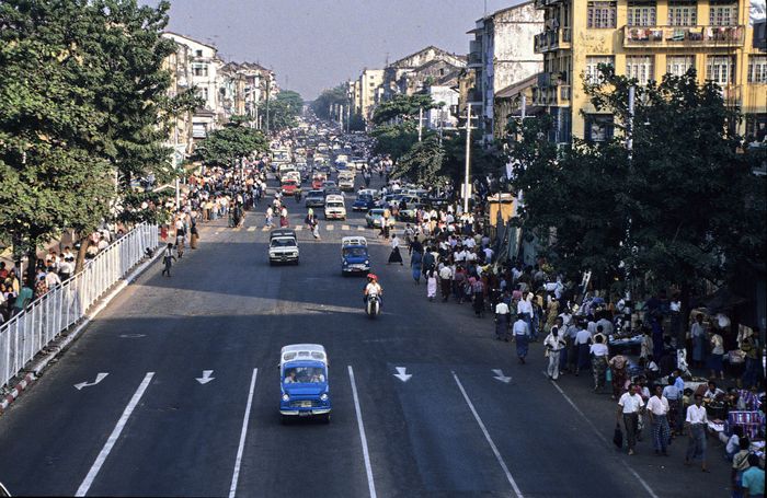 20. Ещё один город с архаичным транспортом в 1992 году — бирманская столица Рангун. С 1962 г. там строили что-то напоминающее социализм и иностранных автомобилей почти не ввозили. А с 1988 года в стране стали происходить значимые перемены, которые, конечно же, не затронули колорит местных улиц 25 лет назад: