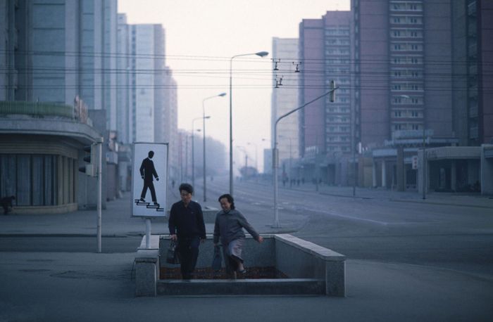 Одно фото вместило в себя практически весь чучхейский урбанизм того времени и абсурд подземных переходов через пустые улицы.